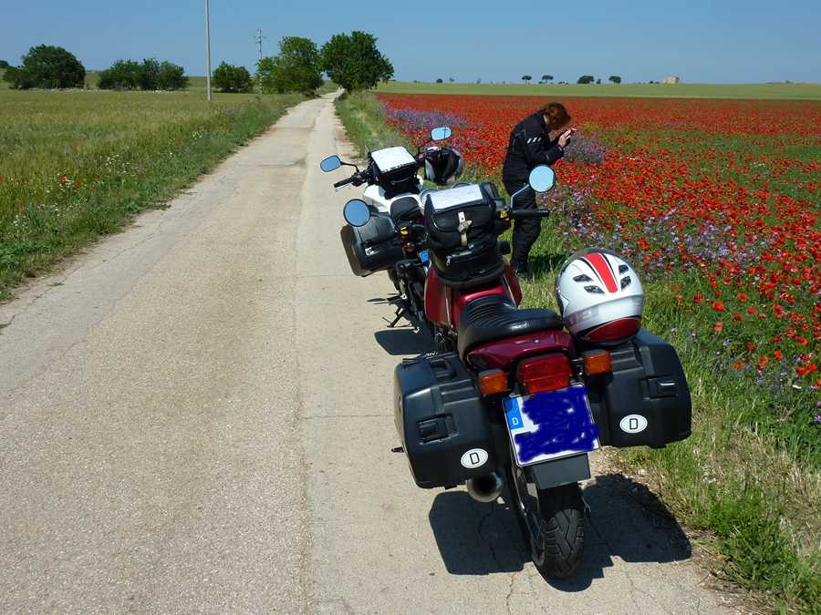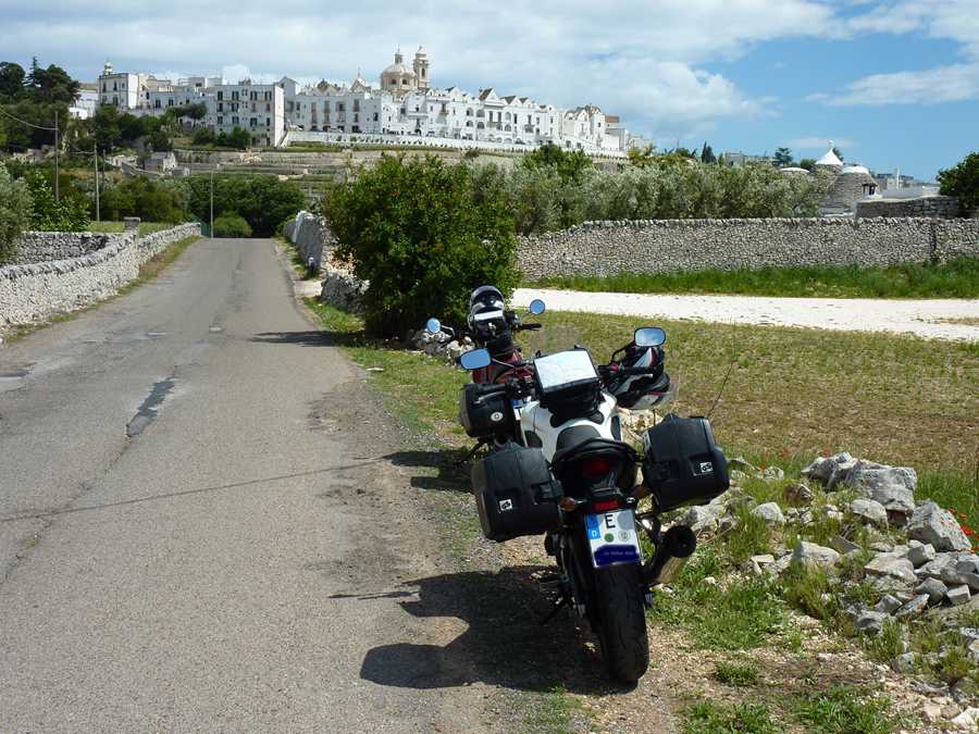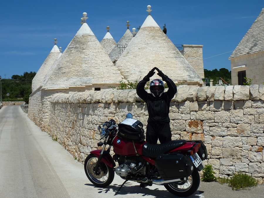 Auch haben wir einen Abstecher über das Castel del Monte gemacht. Vom Weiten schon kann man die streng achteckige Burg des Staufenkaisers Friedrich Zwo sehen. (Übrigens: Der Ort, den auch der Staufenkaiser zu Fuß auf gesucht haben dürfte, hatte zwar noch keine Wasserspülung, aber auch vor knapp 800 Jahren schon fast westlichen (Ideal-) Standard.) Von Martina Franca aus erkunden wird die Gegend im Umfeld: Jede Menge Trulli, weiße Städte, reichlich italienische Impressionen und Lebensart. Die Leute sind sehr freundlich, hilfsbereit und absolut tiefenentspannt. Wenn die Hupe ertönt, und das tut sie sehr oft, so gilt das nie der Rüge der anderen Verkehrsteilnehmer oder gar der automobilen Kritik an den doofen Motorradtouristen, (die gelegentlich an der höchst eigenwilligen Beschilderung oder Verkehrsführung schier verzweifeln), sondern sie grüßen nur mal eben den Nachbarn. Oder den Schwager. Die Bekannte aus der Bäckerei, oder Francesco, da hinten, hallo, hast Du mich nicht gehört? Fraaaaannncesskooo!! Huuuuuuuuuup!!