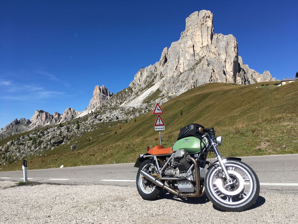 Brennerlandstrasse, über Klausen und das Grödner Joch erreiche ich Arabba und kehre in meinem Stammlokal ein. Mittagszeit. Weiter Richtung Cortina, kurz davor rechts ab über den Passo di Giau. Die Straßen sind (für Dolomitenverhältnisse) fast leer und super sauber, man kann es fliegen lassen. Beim Fotostopp merke ich, wie das linke Handgelenk doch ziemlich schmerzt, da bin ich in der Früh wohl doch heftiger draufgefallen, als gedacht. Die tiefen Stummel der LM tun ihr übriges.