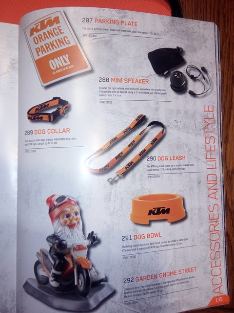 In Sachen Devotionalien kann ich ein paar Bilder einbringen, was sich andere Hersteller dazu alles einfallen lassen. Unsere Jüngste hat sich jetzt ein indisches Motorrad gekauft. Da ist eine hochwertig ausgeführte Mappe in den Werksfarben dabei, wo neben Betriebsanleitung, Garantieunterlagen, Werkstattverzeichnis, Zubehörkatalog modellspezifisch, auch ein dicker Katalog mit allerlei Drumherum dabei ist. Da ist Schutzbekleidung für jeden Einsatzzweck von Moto Cross bis Rennstrecke genauso drin, wie alles für die Freizeit, von T Shirts bis Reisetaschen und einige ganz wichtige Dinge, die jeder Motorradfahrer braucht: