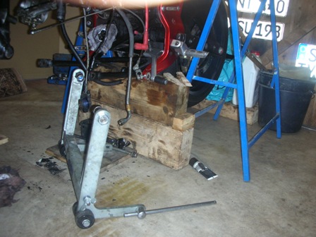 Und ich habe schon mehrmals drüber nachgedacht, so einen Ständer so zu bauen, dass er senkrecht hochfährt, dann könnte man das Motorrad vorne mit einem Vorderrradhalter fixieren und zusätzlich in der Höhe hinter variieren.