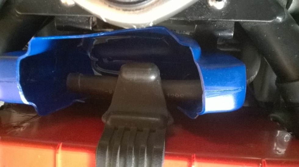 Bei meiner Kupplungsbastelei im Winter habe ich unter der rechten Seite des LuFi-Kastens eine Einkerbung entdeckt, durch die der Entlüftungsschlauch passt. Etwas verlängert landet dieser hinter dem Tank und kann in ein Behältnis abfließen.