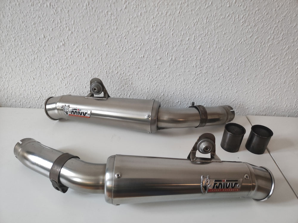 diemo hat geschrieben: Fr 26. Jan 2024, 11:02 verkaufe meine Mivv Endtöpfe. Die Teile sind in einem sehr guten Zustand. Befestigungsschellen und Schrauben sind dabei. Ebenfalls dabei sind zwei Kat-Patronen von Akrapovic. Werden einfach wie Patronen in den Sammler gesteckt. Ist notwendig, da bei den V11 Katmodellen der Kat im Endtopf ist. Die Teile haben eine ABE für alle V11 Modelle. Machen einen recht brachialen, vollen Sound. NP Mivvs bei Kauf knappe 500 Euro, die Kats je Stück knappe 100 Euro.