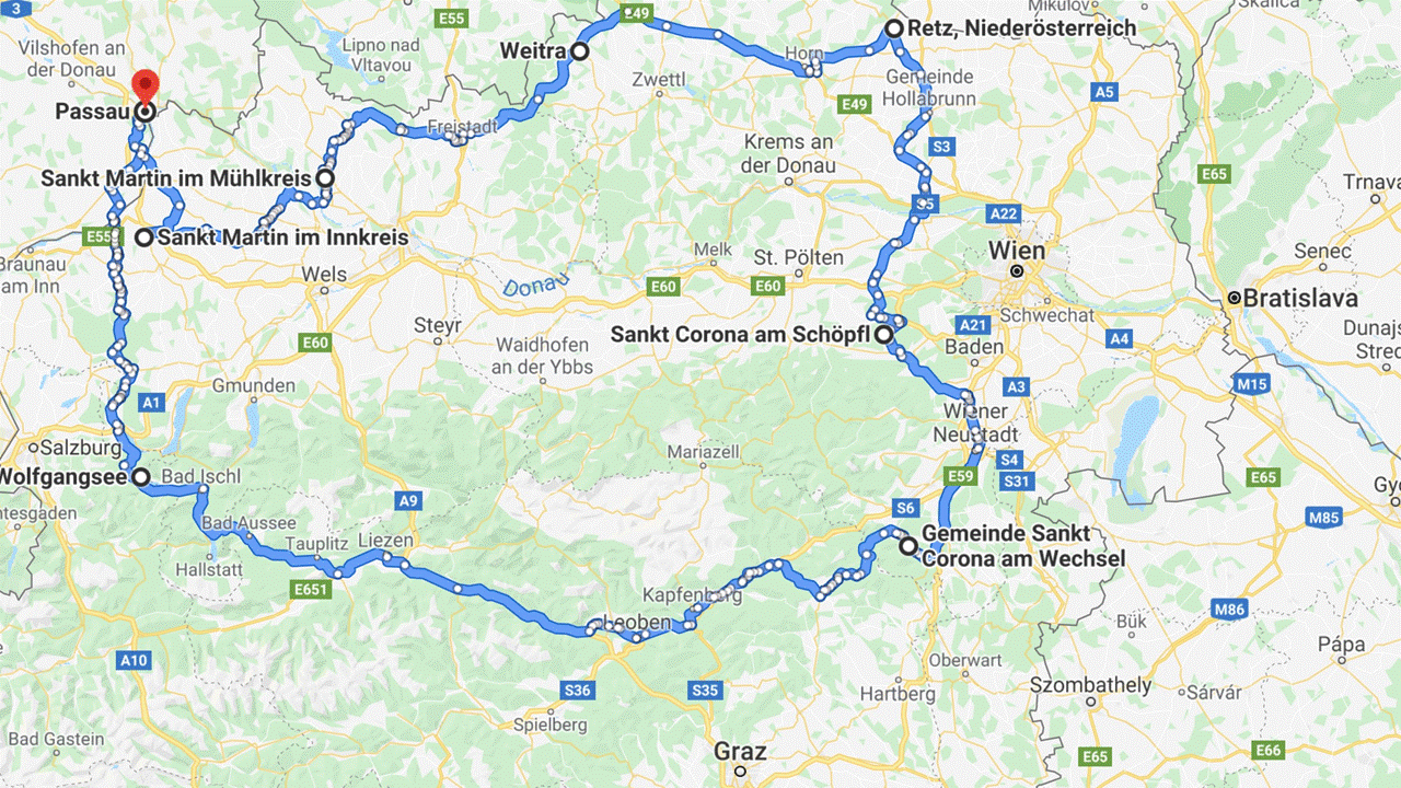 Ausgangspunkt soll Passau sein, in Deutschland ganz rechts unten.