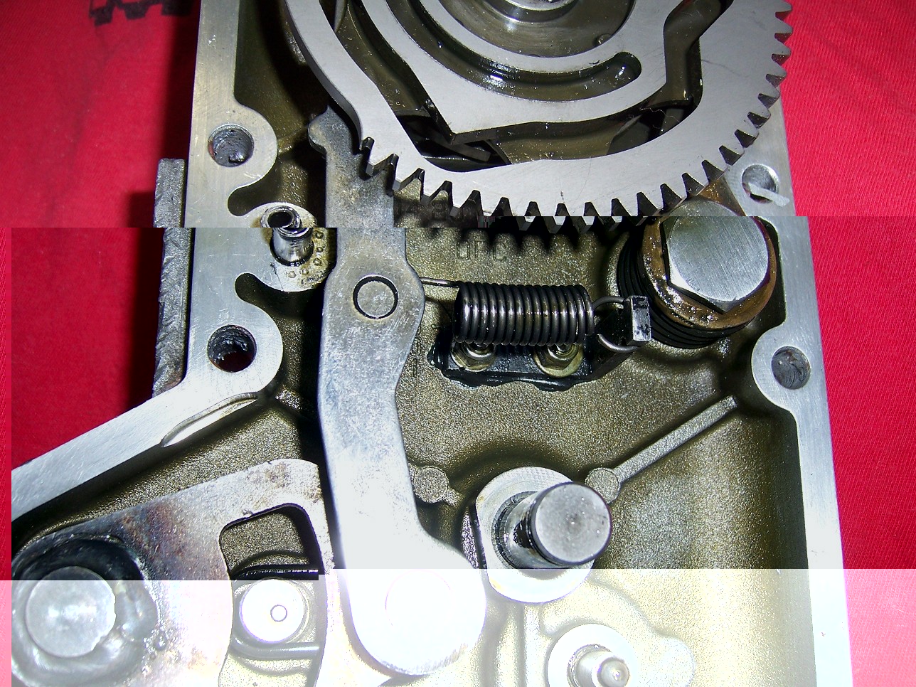 man(n) hat einen zusätzlichen Blechwinkel angebracht und dort eine kleine Zugfeder angehängt, die den Hebel zum, sagen wir mal, Schaltrad zieht