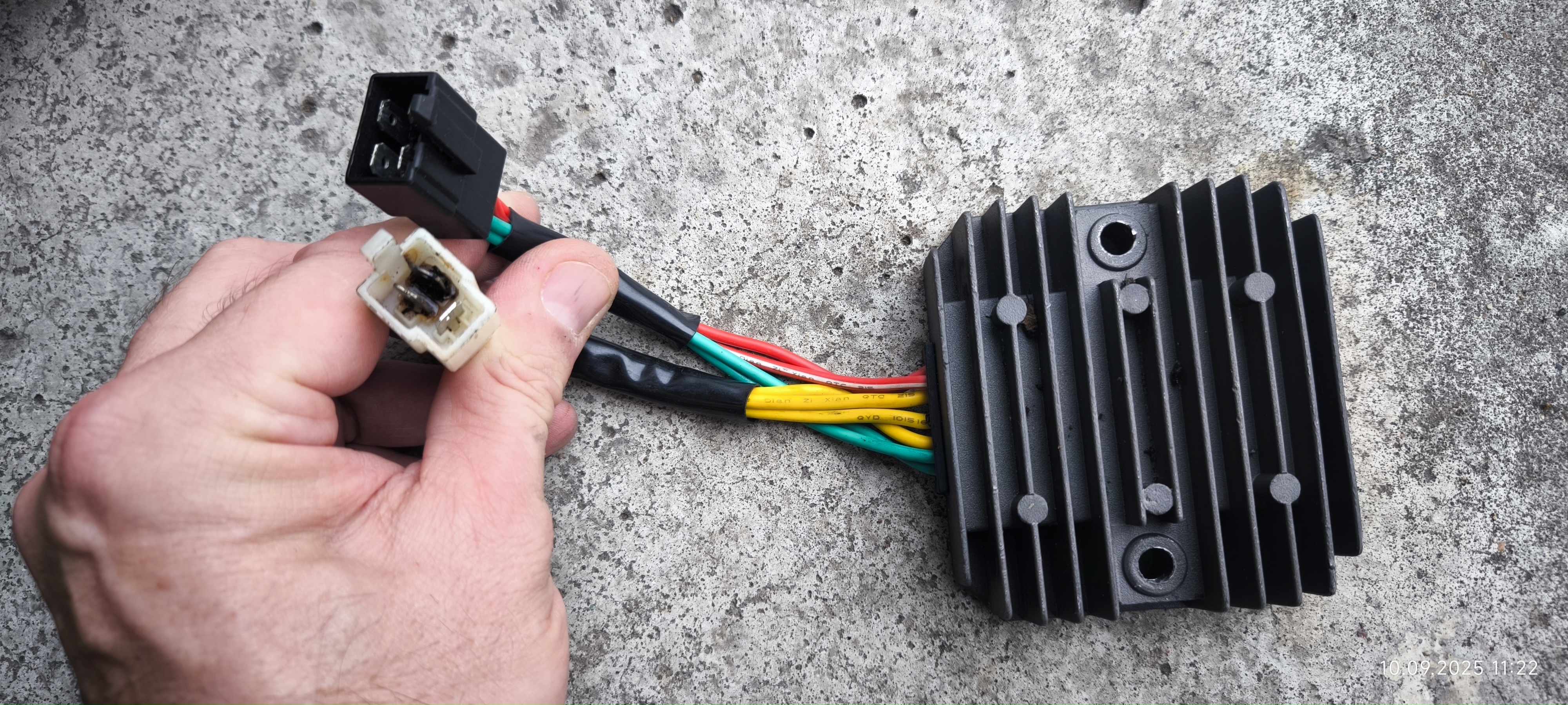 der Chinese passt sowohl von den Bananensteckern als auch von den Befestigungslöchern, das Ding ist eine exakte Kopie des Ducati Energia. Die Kabel sind ein wenig dünner, und die Bananenstecker sitzen nicht so fest oder stramm im Kabelbaum wie die der Ducati Energias. Und das gefiel mir nicht, wo Ströme fließen sollte guter und fester Kontakt sein, sonst Übergangswiderstand und Schmor und Brutzel wie bei den KT Shindengensteckern...