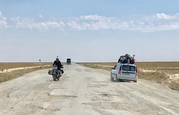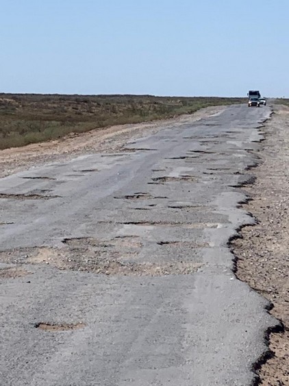 Danach begrüsste uns Kasachstan mit 60 Kilometer Piste. Nach der Piste währte die Freude über Asphalt beim Anblick des Strassenzustandes nicht lange. 200 Kilometer übelste Schlaglochpiste. Für die Gesamtdistanz von gut 300 Kilometer benötigten wir mit dem Grenzübertritt von 7.30 Uhr bis 19.00 Uhr.