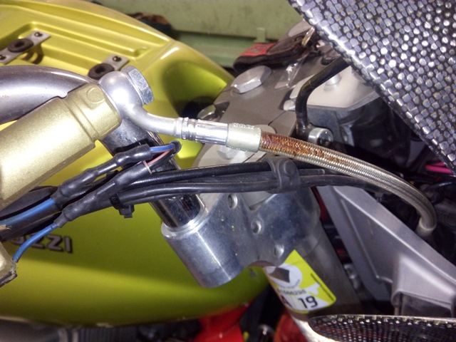 Ich weiß jetzt nicht, wieviel Druck in der Bremsleitung entsteht. Aber wenn ich mir das Hebelwerk und die Kolbengröße anschaue, dann können da schon über 100 bar zusammenkommen. Und das hält der Teflonschlauch ohne Armierung nicht aus. Also wird die Leitung getauscht. Jetzt ist es noch ein optischer Fehler. Aber mit der Zeit wird es zum Risiko und da ist es klüger eine Reparatur, die sowieso unausweichlich ist gleich zu erledigen.