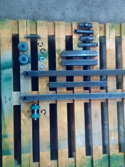 Steht schon drauf. Gut 4 Stunden gebastelt, Materialkosten nahe 0, weil nur Reststücke verbaut wurden. Aber solide Technik. Elastische Doppelrollen, die waren früher auf Inlineskatern, Achsen aus 22 mm Automatenstahl, die Schubstücke aus Walterscheid Gelenkwellenrohr geschnitten = Teflonbeschichtet. Wird wohl bei 500 kg statischer Belastung noch keinen Mucks machen.