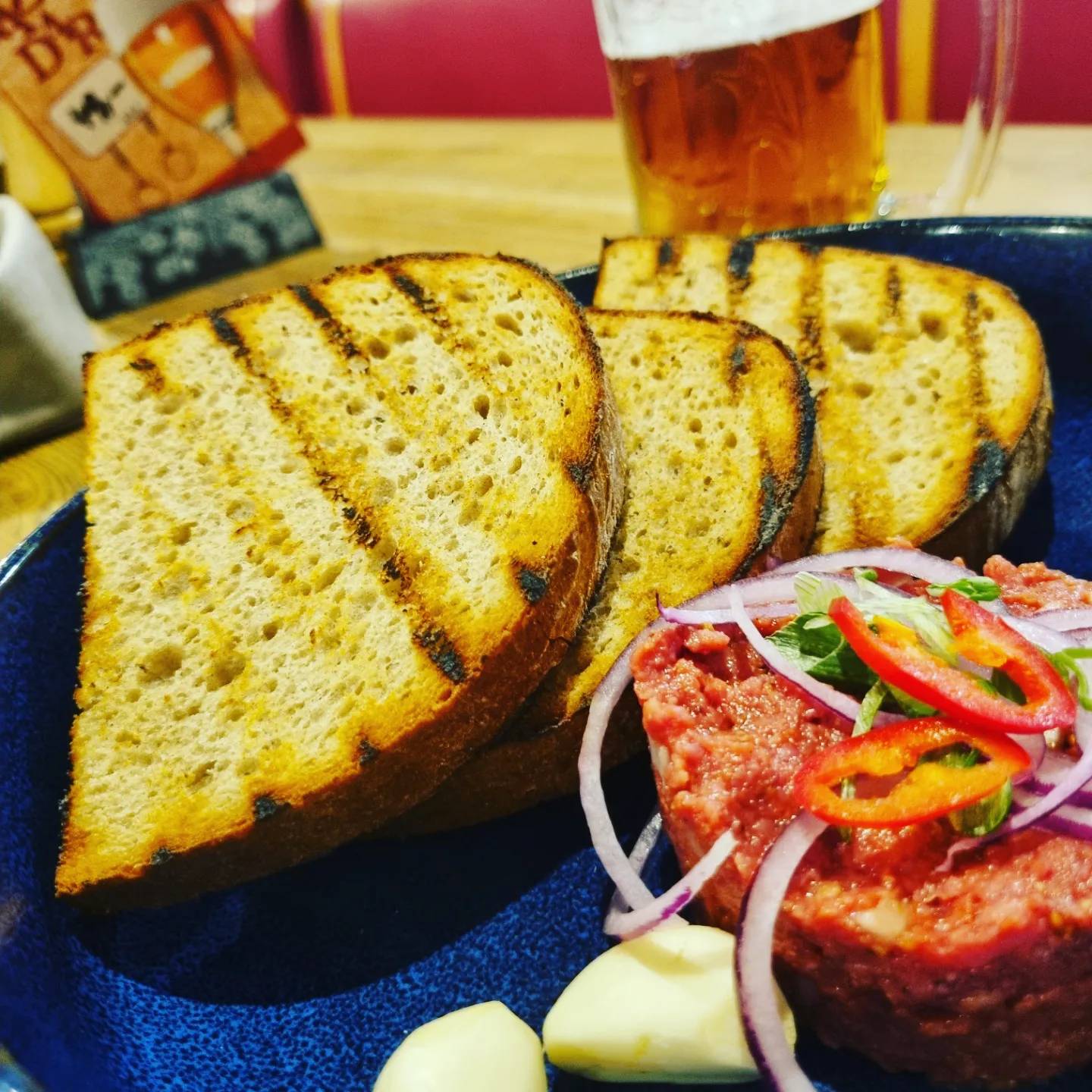 Natürlich gibts Pilsner Urquell zum Abendessen, und Beef Tartar mit Knoblauch.