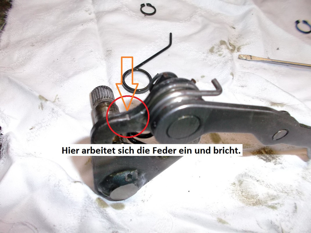 Nicht die Stelle in deinem Bild, ich spreche von der Schaltwelle die an der Sperrklinke aufgehängt ist! Da arbeitet sich die Feder ein, kann nicht mehr gleiten und bricht. Diesen Bereich prüfen, und ggf. mit Feile bearbeiten, damit sich die Feder dort nicht mehr einhaken kann...