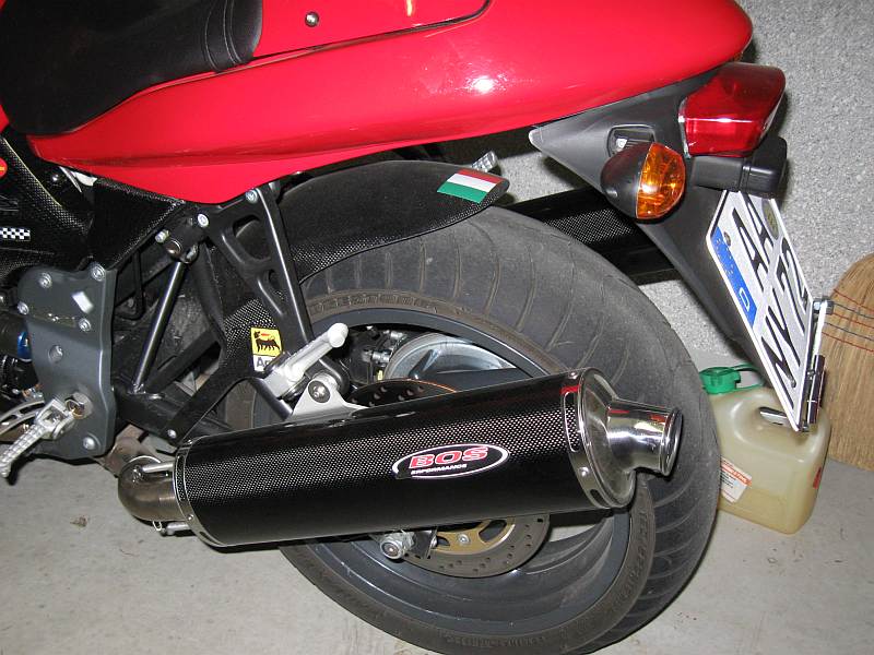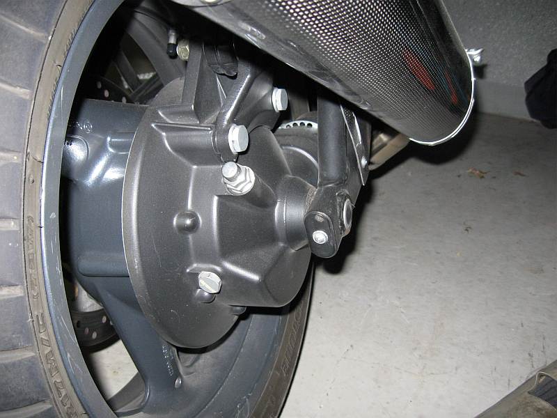 Bei mir fehlt auf der linken Seite am Hinterrad eine der beiden Schrauben, die dieses silberfarbige Plastikteil festgeschraubt hat.