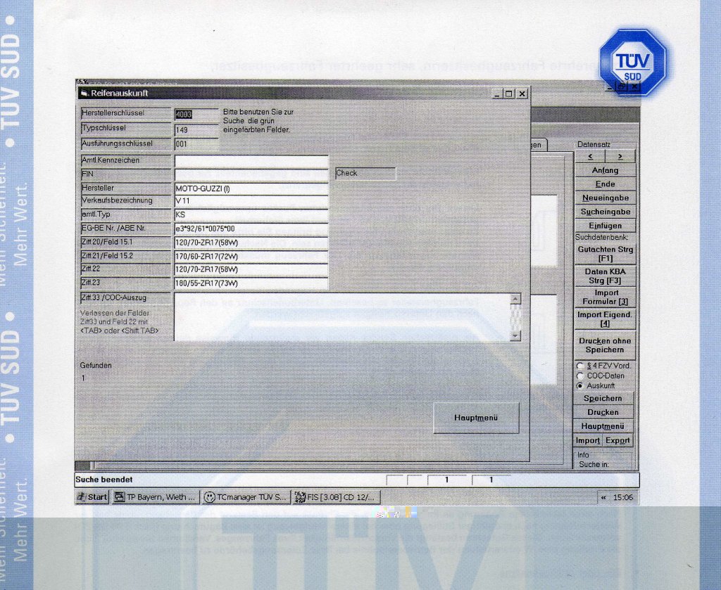 Mitte Januar 2008 habe ich mich um eine Klärung des Problems bemüht. Ich habe bei der örtlichen Polizeidienststelle vorgesprochen und mich mit einem Prüfingenieur unserer TÜV-Außenstelle in Verbindung gesetzt. Einhellige Aussage, eine Fabrikatsbindung gibt es nicht mehr. Entspricht ein Reifen der vorgegebenen Spezifikation, ist das Reifenfabrikat ohne Belang. Der Ingenieur des TÜV gab mir zwei Ausdrucke aus seiner Datenbank mit, in denen diese Aussage belegt wurde. Die Blätter durfte ich ausdrücklich ins Forum stellen, was ich mit einem begleitenden Artikel auch getan habe.