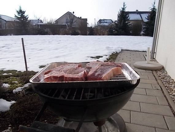 Schön warm bekleidet genussvoll den Fleischeslüsten auf der Terrasse bei Sonnenschein und - 2 Grad C gefröhnt.